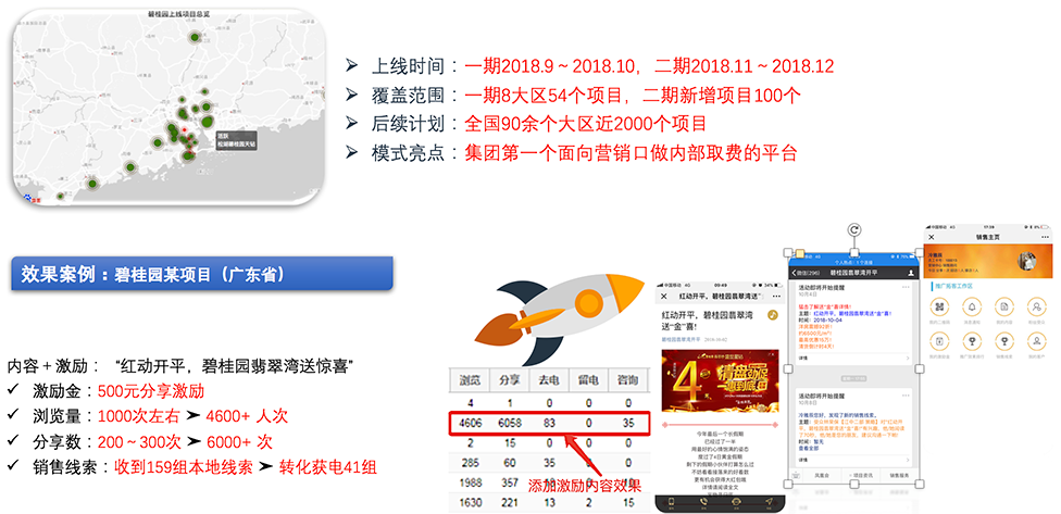 原圈科技为碧桂园提供了“AI社交营销获客平台”“社交营销黑科技”,产品上线3个多月已经实施超过60个地产项目。初步实施的区域和项目虽然成本花费不多,但是回报却很让人惊喜。平台上线第一场区域性活动,仅投入数千元费用,得到的回报却是客户主动留电1700多组、50多组到访、当天数套成交!