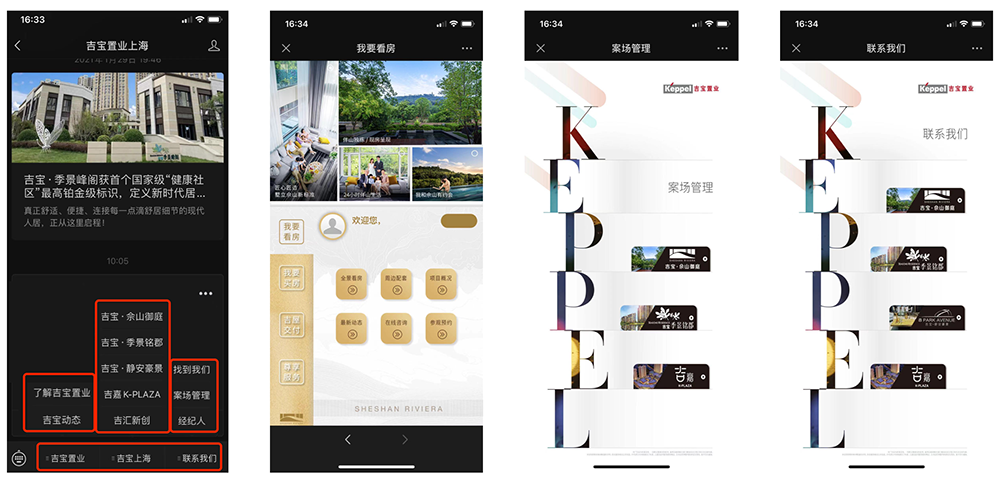 吉宝上海区域将各项目内容整合在区域号菜单内,从集团介绍到各项目具体线上展示介绍,再到项目渠道案场管理工作区入口,完成区域公众号的定制整合,所有项目的粉丝受众集中在一个平台,集中触达集中运营,既节约运营成本,又提升客户体验