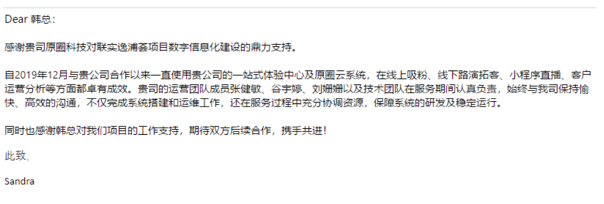 愉快、高效且有显著成效的合作令联实决定2021年继续续约,且在当前合作基础上多次增购原圈其他功能模块,并在年底发送感谢信予以肯定
